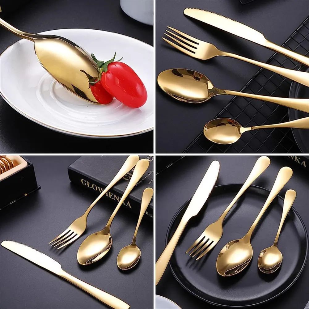 Transforma tus comidas en una experiencia de lujo con nuestro exclusivo juego de cubiertos dorados de 24 piezas.